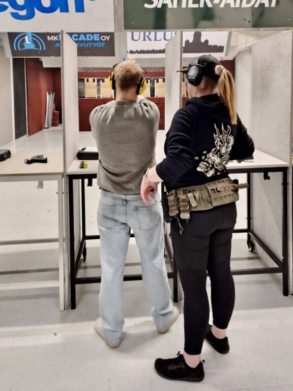 Nuorten pistooliammuntaharjoitus Reserviläisten ampumaradalla Keravan Klondyke-talolla toukokuussa 2025.